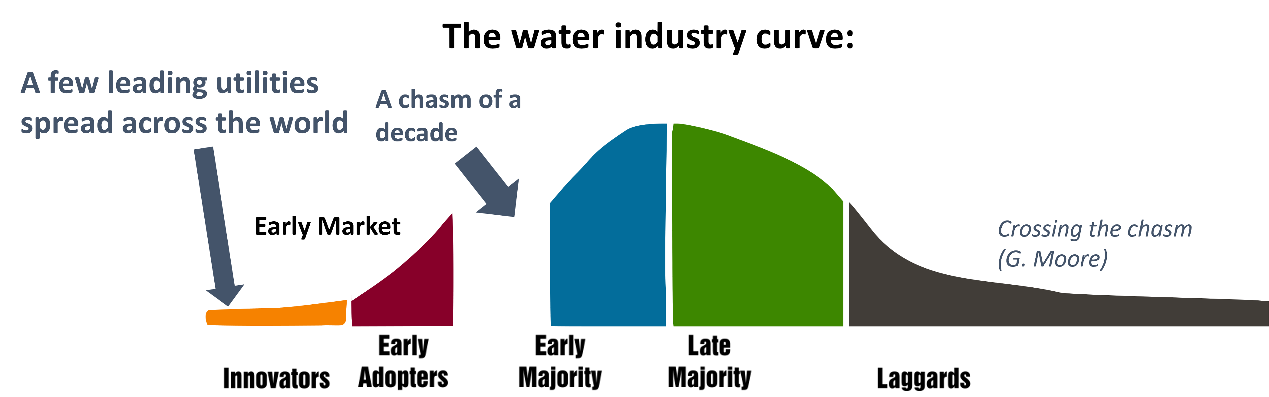 Have you heard about the chasm? It describes the classical market stages an innovation has to go through to finally reach adoption by the mainstream market (Figure 2). Your first clients usually are innovative water companies willing to test your solution. Bit by bit, more mainstream customers will use your tech and mass adoption follows. It is however critical to reach the mainstream market fast, as the upfront R&D efforts in water are often big and your burning rate can kill you if sales don’t follow.